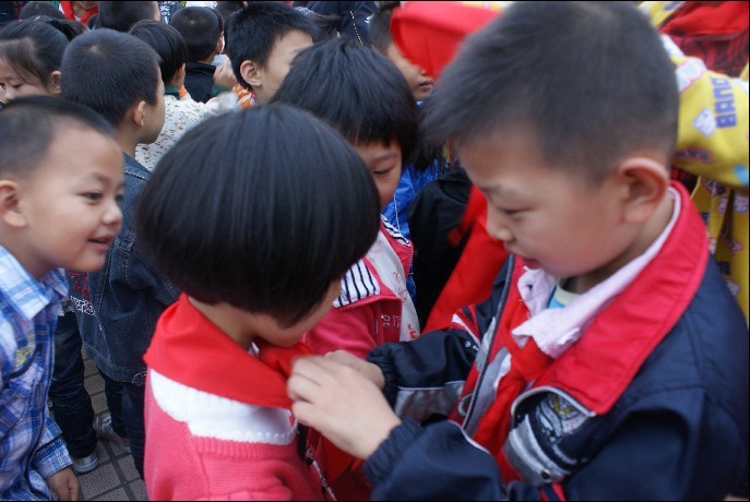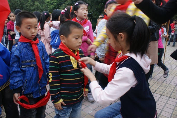 3、大会进行第二项,请辅导员老师和大队委员、中队委员为新队员佩戴红领巾。(老队员为新队员佩戴红领巾)