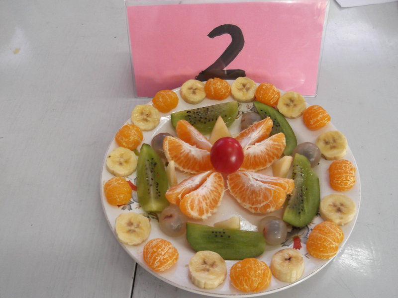 当每一组代表把自己小组合作与智慧的结晶展示交流时,同学们个个绽放着灿烂的笑脸。他们还给各自的拼盘取了好听名字:百果宴会、花开富贵、蒸蒸日上、含笑迎花……那一盘盘五颜六色,精致玲珑的水果拼盘,已经不再那么简单,而是一件件用巧妙双手和细腻心灵编织出来的珍贵艺术品……