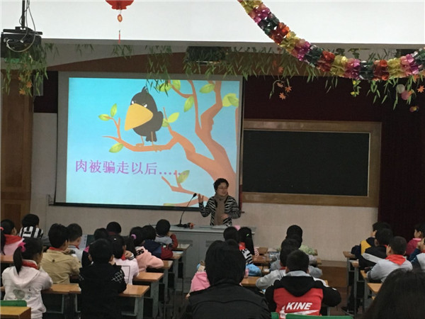 首先,四年级杨小芬老师上了一节以“受骗以后”为题的想象作文研讨课。杨老师教学环节清晰,语言生动,通过让学生复述二年级的《狐狸与乌鸦》的课文内容,从而让学生插上想象的翅膀,根据狐狸与乌鸦的性格特征来写一组对话或计策,充分地调动了学生的写作兴趣。学生在教师的引导下由会说到会写,课堂上学生分享的习作充满着童真童趣。