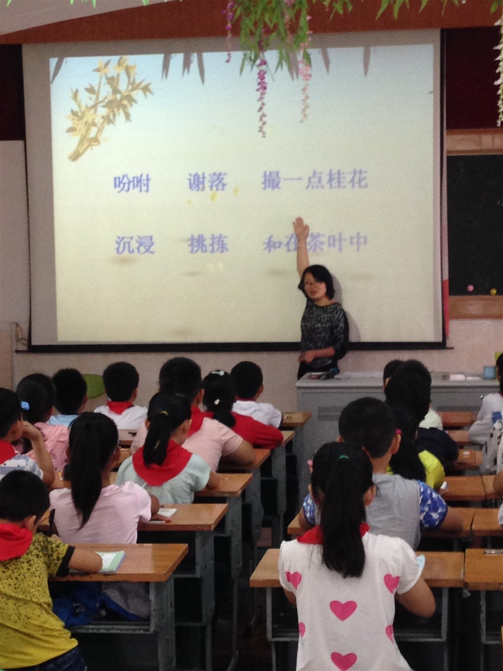 9月27日上午,金色的秋日阳光格外明媚,校园里弥漫着诱人的桂花香,沁入每个老师和学生的心田。小河中心小学阶梯教室,王丽红和缪天祎两位年轻老师分别执教了《桂花雨》、《变色龙》。课后,老师们展开热烈的研讨。