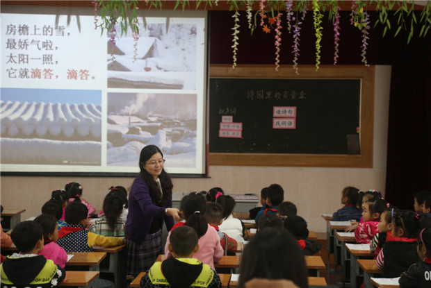 如果说单篇课文的学习属于微观层次的阅读,整本书属于宏观层次的阅读,那么类文阅读就属于中观层次的阅读,中观层次的阅读正是孩子们所缺少的。本次活动由市名师工作室领衔人金玉老师为大家展示了一节精彩的类文阅读课《诗园里的百音盒》,所选的四首儿童诗意境优美、语言童趣、想象丰富。金老师深入钻研、大胆尝试 ,将四首儿童诗进行比较阅读,以诗中的拟声词为切入点,引导学生通过读诗句、找词语、想画面的方法,体会了百音诗歌园的美妙,丰富了学生的想象能力,听课的老师们沉浸在金主任童真童趣的诗意课堂中。