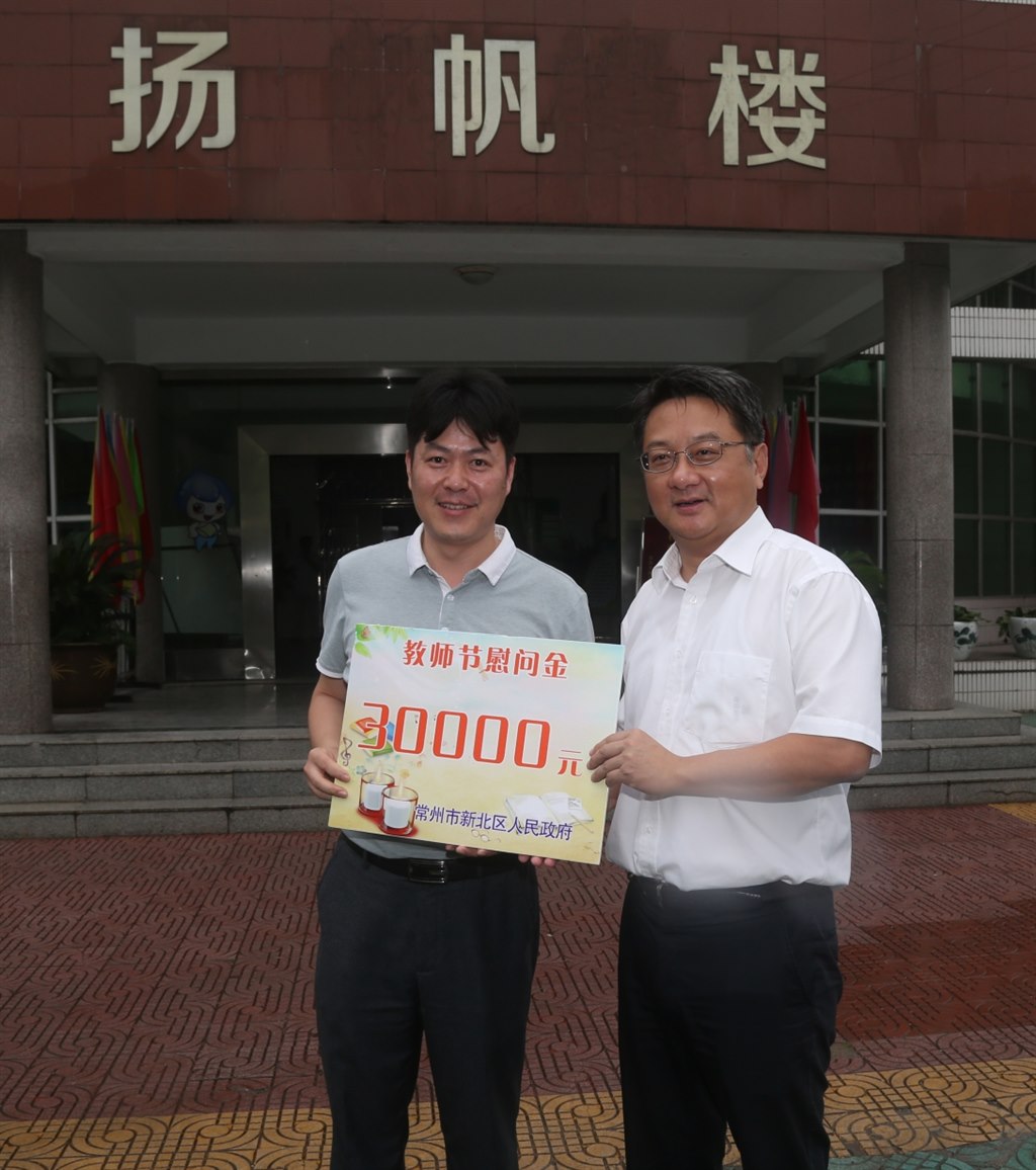 一进校门,周书记一行与孟河镇党委书记高炎、副镇长石清华,我校潘建强校长等行政领导进行了亲切会晤。教师节将近,贴心的周书记为我校全体教师带来了节日慰问金。